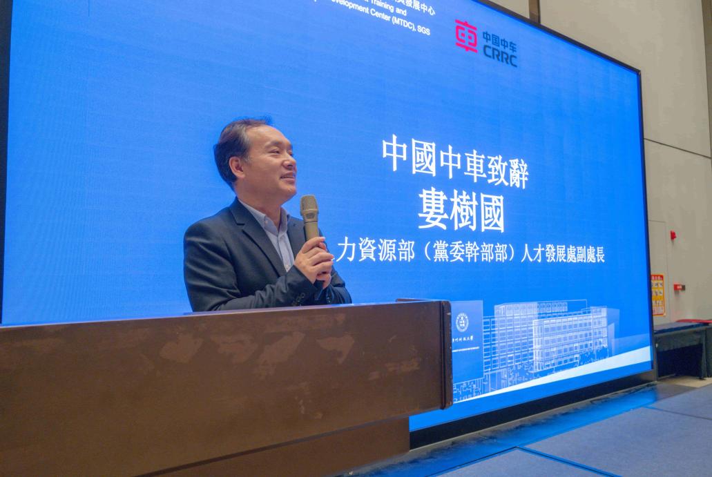 中國中車人力資源部(黨委幹部部)人才發展處副處長婁樹國代表中國中車致辭。婁副處長表示中車高度重視人才培養,並高度肯定了海外DLS業務人才培訓班的卓越成效。婁副處長向全體學員提出三點期望:一是課程結束後需持續鞏固學習語言知識,做到常學常新、融會貫通;二是盡快學以致用,將所學轉化為實幹能力;三是快速成長為DLS業務發展的骨幹,為中車國際業務高質量發展做出貢獻。最後,婁副處長代表中車人力資源部向澳科大致送「感謝函」。