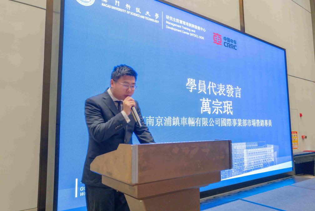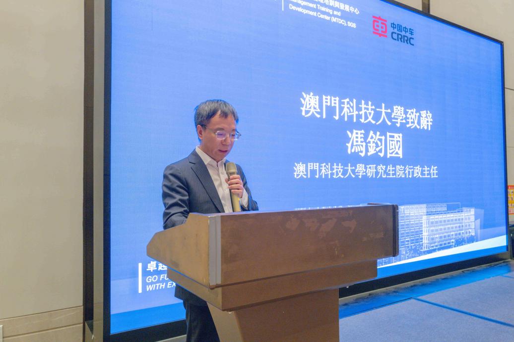 澳科大研究生院馮主任代表大學致辭,馮主任首先感謝中車對培訓項目的高度肯定,他表示澳科大將一如既往地助力中車國際化人才培養。馮主任高度讚揚了本期學員們展現出的「理解與包容、自律與追求卓越、互學與互鑒」的優秀品質,並號召澳科大全體學生學習。最後,馮主任寄語學員們主動擁抱新知識、新技術與新思維,為中車高鐵「金名片」閃耀世界貢獻自己的力量。