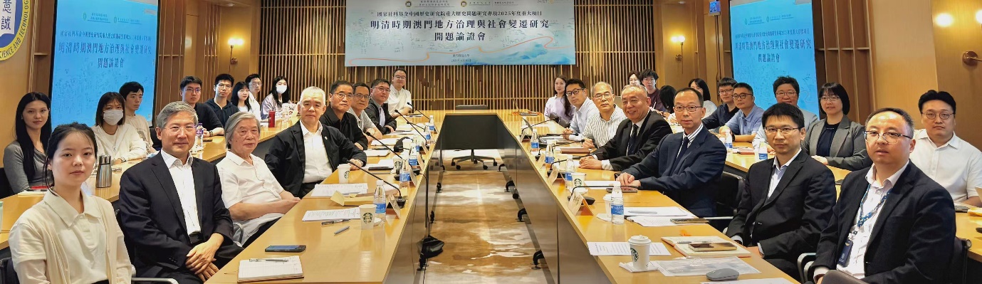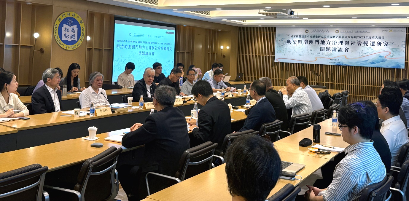 在澳門科技大學26周年校慶之際,2026年4月10日,橫琴粵澳深度合作區澳科大創新科技研究院與澳門科技大學社會和文化研究所在大學R104舉辦「國家社科基金中國歷史研究院重大歷史問題研究專項2025年度重大招標項目『明清時期澳門地方治理與社會變遷研究』開題論證會」。澳科大唐嘉樂副校長,社會和文化研究所所長、中國歷史研究院澳門歷史研究中心常務副主任林廣志教授,北京大學錢乘旦講席教授(線上),華中師範大學馬敏教授(線上),中國社會科學院經濟研究所魏明孔研究員,澳科大湯開建講座教授,暨南大學澳門研究院金國平研究員(線上),廣東省社會科學院李慶新研究員,中國歷史研究院澳門歷史研究中心副主任李進峰研究員,中國社會科學院中國邊疆研究所侯毅研究員,課題組首席專家、澳科大社文所陳文源訪問教授,子課題負責人、澳門理工大學林發欽教授,子課題負責人、澳科大鄭劍藝副教授,子課題負責人、廣東工業大學張中鵬副教授,以及課題組成員、師生等近50人出席。開題論證會由林廣志所長主持。
